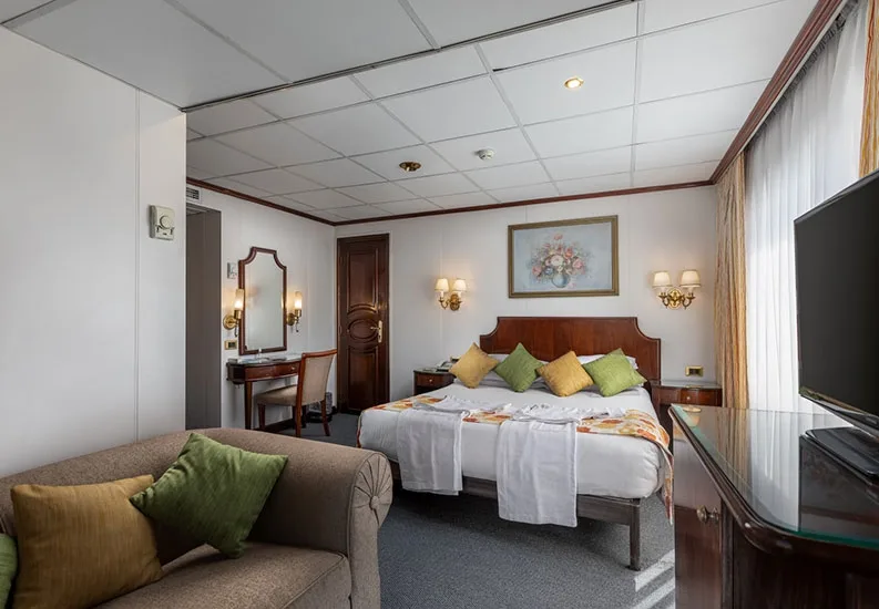 Votre croisière de luxe, véritable refuge flottant, vous offre une expérience intime et exclusive pour découvrir les trésors millénaires de Louxor et d’Assouan. Avec seulement 65 cabines raffinées, véritables écrins de confort et d’élégance, vous aurez l’impression d’être un pharaon moderne naviguant sur les eaux sacrées du Nil.